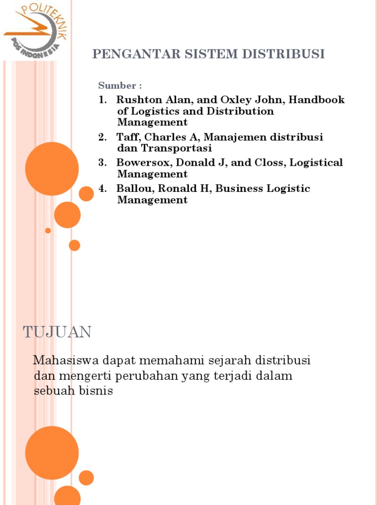 1 Pengantar Sistem Distribusi from imgv2-2-f.scribdassets.com Menurut abbas (2012), manajemen logistik adalah suatu proses kegiatan fungsional untuk mengelola material, yang meliputi kegiatan perencanaan dan penentuan kebutuhan, penganggaran pengadaan, penyimpanan dan penyaluran, pemeliharaan, penghapusan dan pengendaliannya. Menurut bowersox, ada 2 faktor utama yang menentukan tingkat performa logistik, antara lain: Pengertian transportasi menurut para ahli. Menurut donald walters, pengertian logistik ialah fungsi yang melibatkan perpindahan, mengatur perpindahan barang dan penyimpanan material dalam perjalanannya dari pengirim awal, melalui rantai pasok dan sampai ke pelanggan akhir. Menurut council of losgitic management, logistik diartikan sebagai proses perencanaan, implementasi menurut donal j, bowersox, terdapat dua faktor utama yang menentukan tingkat performa logistik, yaitu : Menurut donald walters, pengertian logistik adalah fungsi yang melibatkan perpindahan, mengatur perpindahan barang, dan penyimpanan material dalam perjalanannya dari pengirim awal, melalui rantai pasok dan sampai ke. Aktivitas logistik (lokasi, fasilitas, transportasi, inventarisasi, komunikasi, dan pengurusan & penyimpanan). Faktor pelayanan (service) adalah suatu tingkat pelayanan perusahaan kepada konsumen.